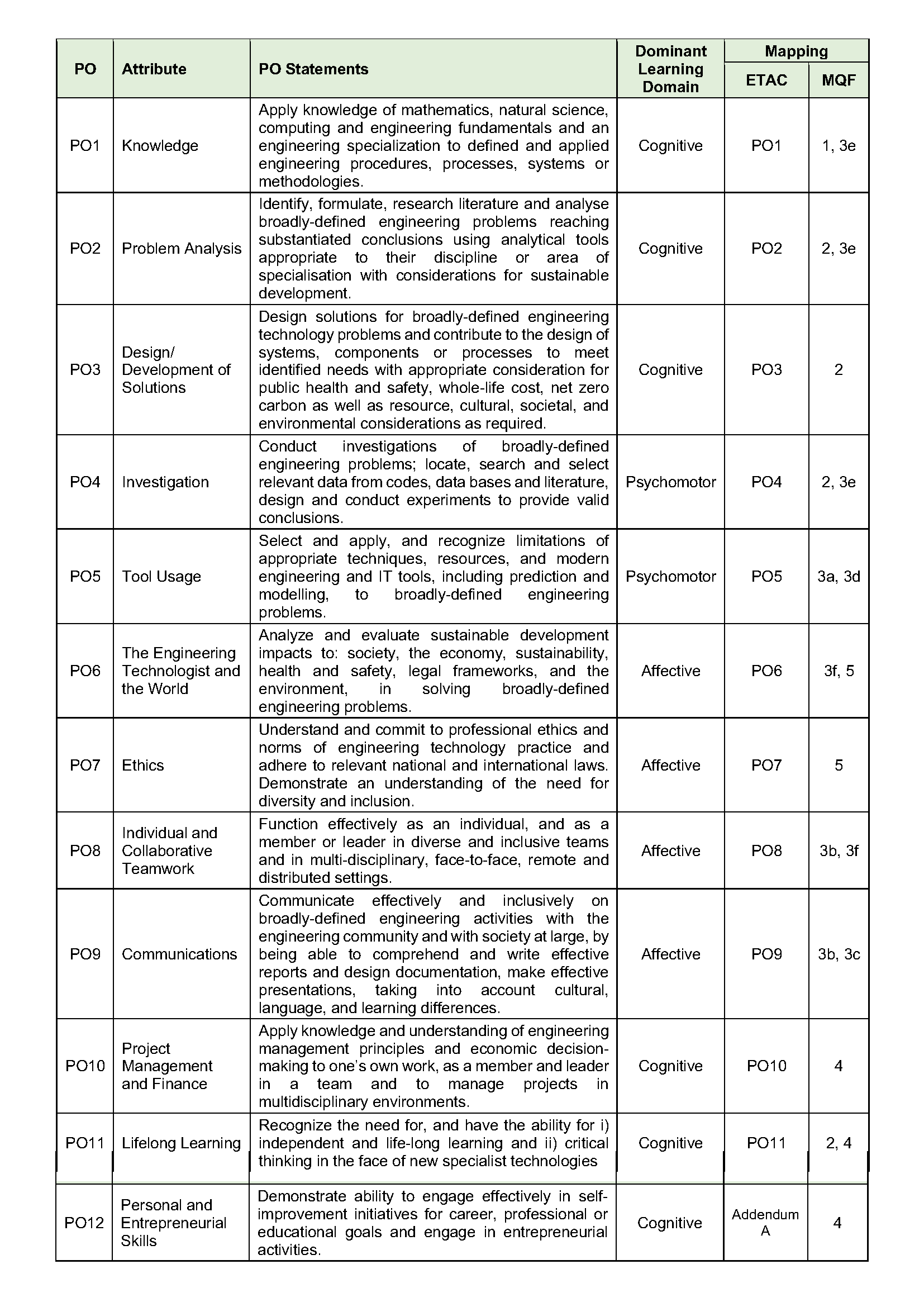 PEO1 Engineering technology graduates engaged in the field of civil engineering technology as demonstrated through career advancement PEO2 Engineering technology graduates who are members and contribute to professional society PEO3 Engineering technology graduates embracing in life-long learning or pursuing continuing education opportunities PEO4 Engineering technology graduates who are technopreneurs -